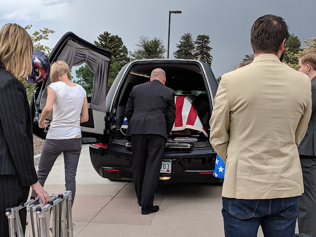 So when the wheel covering was removed from the casket at the end of the service and the flag started falling off, I chuckled. Then when Coltyn jumped up to fix it and every time his hand left the flag it slipped off again, I died laughing.